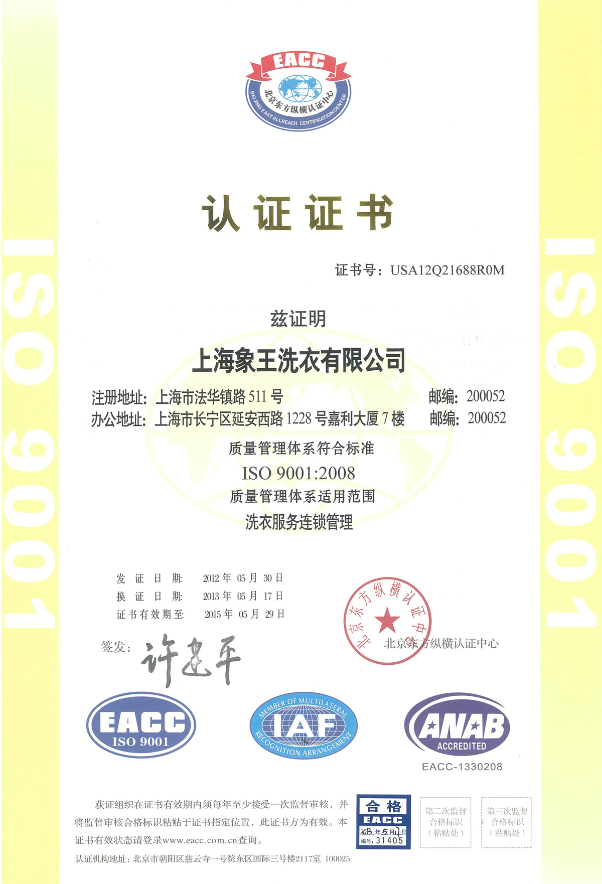 質量管理體系認證,在國內諸多的連鎖品牌中首家通過“洗衣服務連鎖管理”,成為