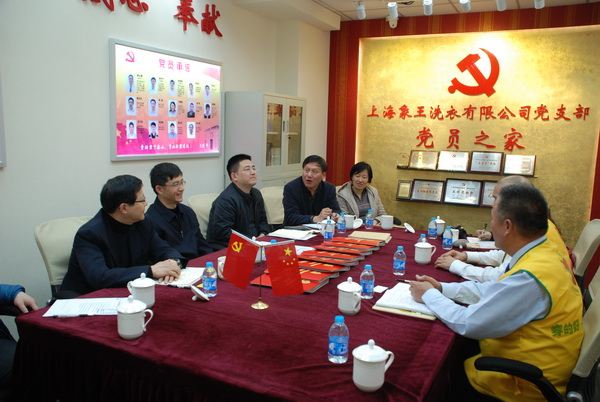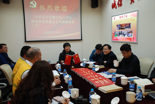 象王董事長黃進能、黨支部書記蔡士剛分別向領導匯報了象王的經營狀況及黨建工作,領導們還觀看了《象王開展臺資企業的黨建工作》宣傳片。王為人書記對象王作為臺資企業在長寧堅守18年,為長寧作出的貢獻及象王黨支部開展的具有臺資企業特色的黨建工作表示了充分的肯定,對象王獲得的各項榮譽表示了祝賀,希望象王在全國洗衣連鎖品牌中能有更優質的發展,希望象王的黨建能更有特色,同時希望象王對政府部門針對臺資企業需提供的服務與支持能諫言。